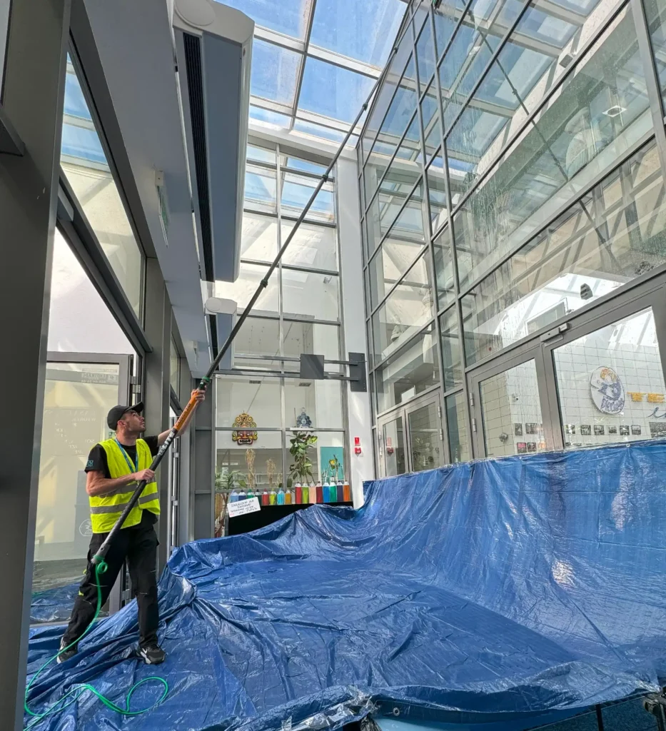 Mycie przeszkleń wodą demineralizowaną z odpowiednim zabezpieczeniem powierzchni - Pleciuga, Teatr Lalek.