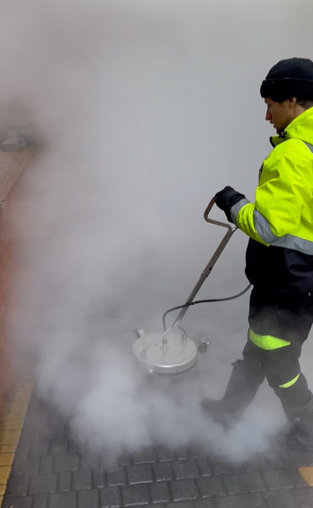Mycie kostki brukowej gorącą wodą o temp. 70*C, przy temperaturze otoczenia 3*C - darmowa sauna! ;)